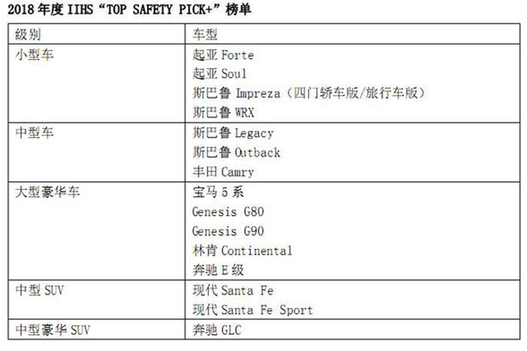 教授现在介绍一下获得2018年度TOP SAFETY PICK和TOP SAFETY PICK+奖项而且中国有的优秀车型 :