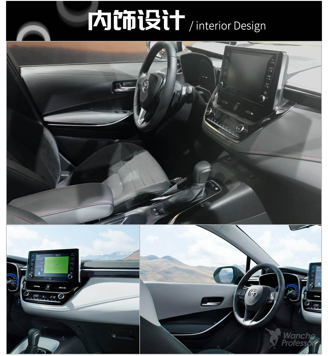 内饰部分,全新卡罗拉旅行车也保留了两厢版本设计,采用了黑白撞色设计,依然是以“简约”为主调。中控显示屏为当今最流行的悬浮式设计,高配车型还将配备JBL音响系统、抬头显示、无线充电等等配置。