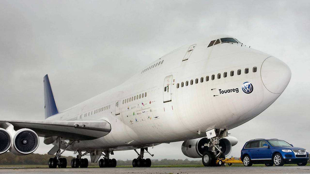 2006年,德国大众试验小组把一辆途锐V10 TDI和一辆波音747飞机拴在一起,这架波音747飞机重达155吨,再加上车身上装载了4345公斤的钢球和钢板,加上车辆自重,总牵引质量超过了160吨,不过在途锐强大的动力加持下,最终这台途锐牵引波音747飞机前行了150米才停下,随后检查结果表明,途锐完好无损!