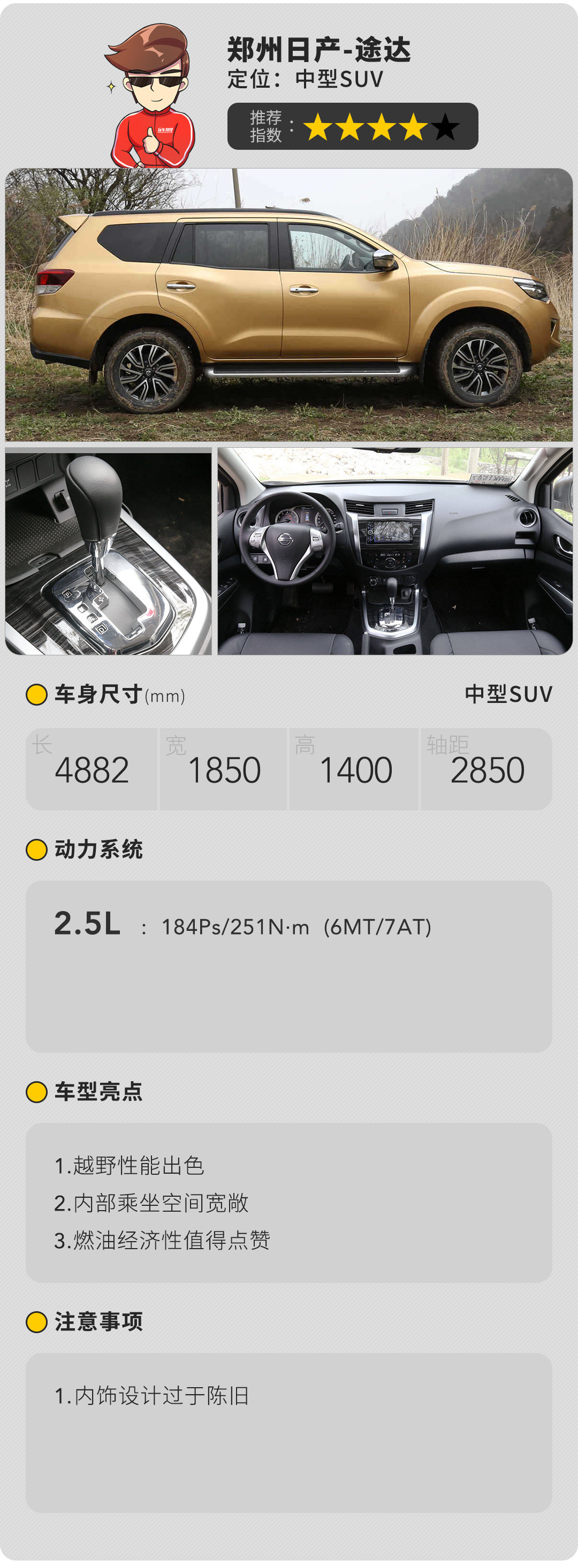有了如此优秀的外部条件,内在自然不能马虎了事。非承载式车身+日产最高技术水平的原装进口7AT变速箱+分时四驱又能为越野打下最坚实的基础。诚然后轮使用鼓刹,年代感十足的内饰的确是抹不去的槽点,但是回首看看价格一切也都释然了。2.5L发动机动力不足也是不争的事实,但如果换装途乐身上VQ40 4.0发动机,动力的提升自不用说,但是价格也会跟着水涨船高,你们还会买账吗?