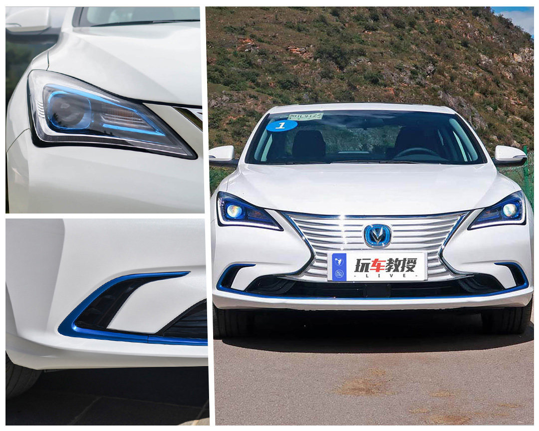 全封闭蝶翼式进气格栅让逸动EV460的车型辨识度极高。新能源车型常用的蓝色设计元素被融入到Logo、前大灯组、前保险杠饰条处,让逸动EV460的身份表露无遗。