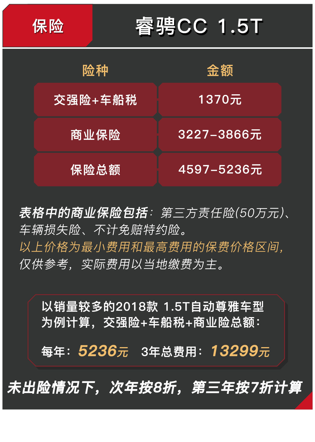 从上述的数据我们可以发现,睿骋CC虽贵为中型车,但在后期用车成本上和领动车型相差的并不是很多,特别是在保养保险费以及工时费上,睿骋CC每年要比领动省出近3000多元。