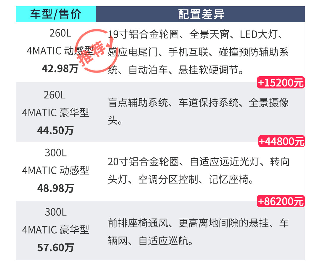 首先对于260L的动力,一般通勤是绝对够用的,没有更高的动力需求情况下,都推荐260L车型。而配置方面,相对于标轴版的入门车型,长轴版的最低配车型已经非常到位,豪车该有的都有了。唯一比较遗憾的是,座椅通风要300L豪华版才有。