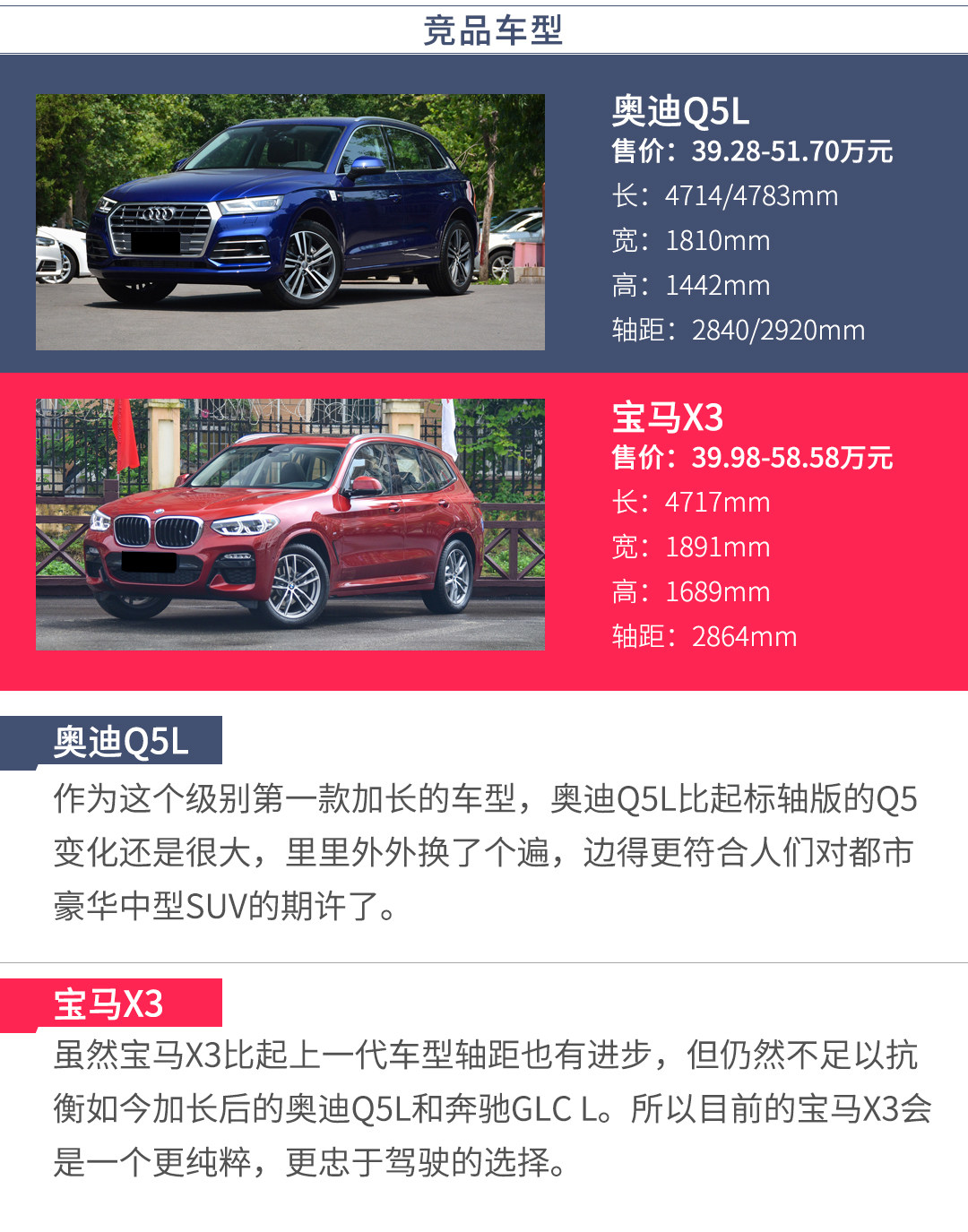 长轴版的GLC与宝马X3在空间表现上已经拉开了很多差距,追求空间的消费者其实根本不用再考虑宝马X3。而奥迪Q5L由于采用了相对功率更低的发动机,其门槛价要比GLC的长轴版更低,再加上目前奥迪Q5L已经开始下放终端优惠,所以性价比方面Q5L会稍微领先一点点。