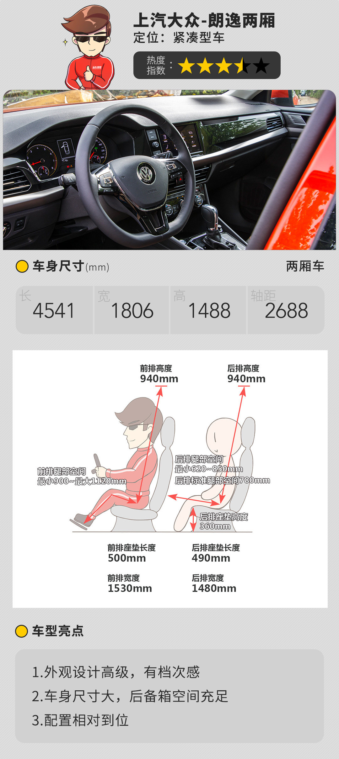 与新一代朗逸一致,朗逸两厢有MQB平台为其背书,因此,朗逸两厢继承了三厢版的所有优点。此外,虽然朗逸两厢版车型与三厢版车型的尺寸差别不大,但是得益于大两厢的设计,让朗逸两厢后排拥有更为优越的乘坐体验,同时,后备箱的实用性也随之提升。由于朗逸两厢属于刚上市不久的车型,目前13.39-16.59万元的售价优惠幅度有限,因此新车的性价比尚未显现出来。