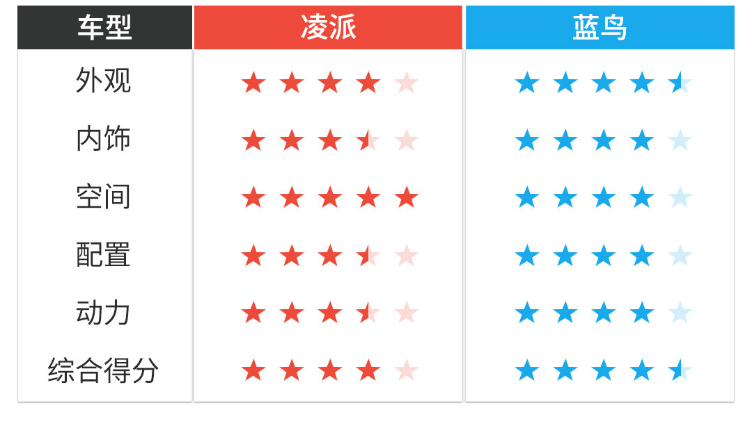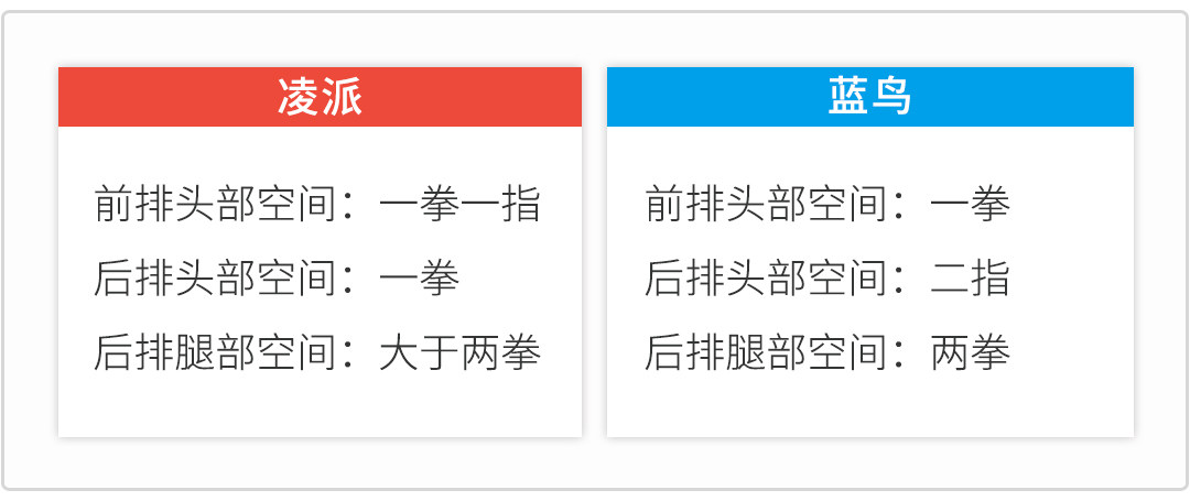 从尺寸对比中,可见新凌派是要比蓝鸟大上整整一圈的,无论是长宽高还是轴距,都更优于蓝鸟。如果从审美角度来看,蓝鸟更小的尺寸看起来回更紧致,而凌派的确有点点肥(上一代车型就有这样的问题),但如果从空间表现的角度来看,那新凌派就将完胜蓝鸟。
