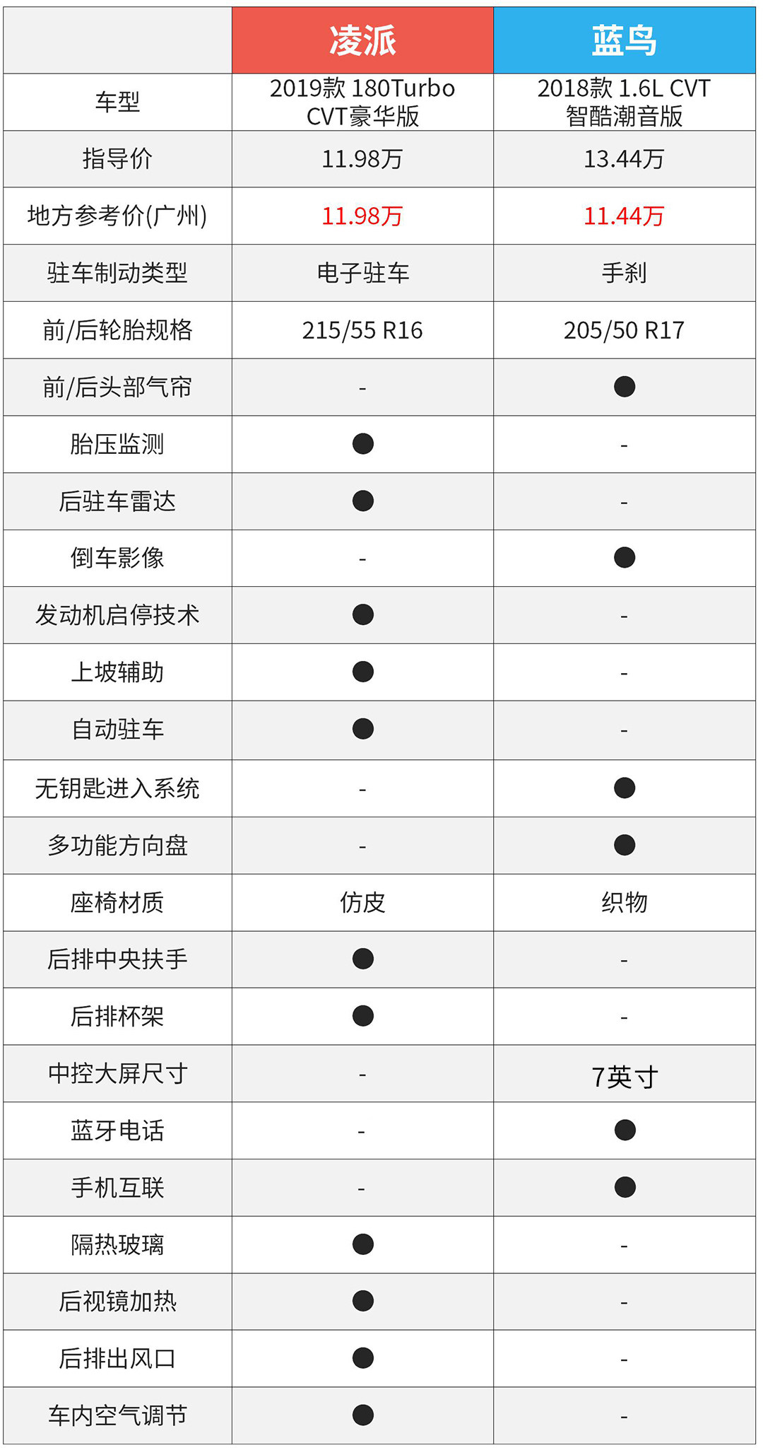 最后的配置对比,由于新凌派刚上市,暂时也没有太多优惠信息,而目前蓝鸟的优惠幅度还是比较大的,所以我们通过优惠后的价格,挑选两款性价比还算不错的车型做对比。其中可见凌派比蓝鸟贵了5000元,但配置也没多有丰富多少,或者说蓝鸟的配置会更占优。