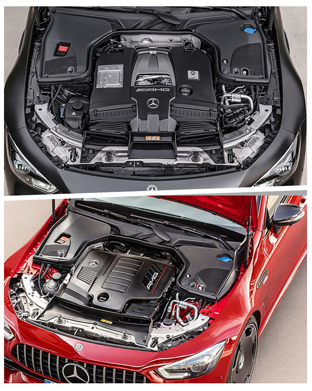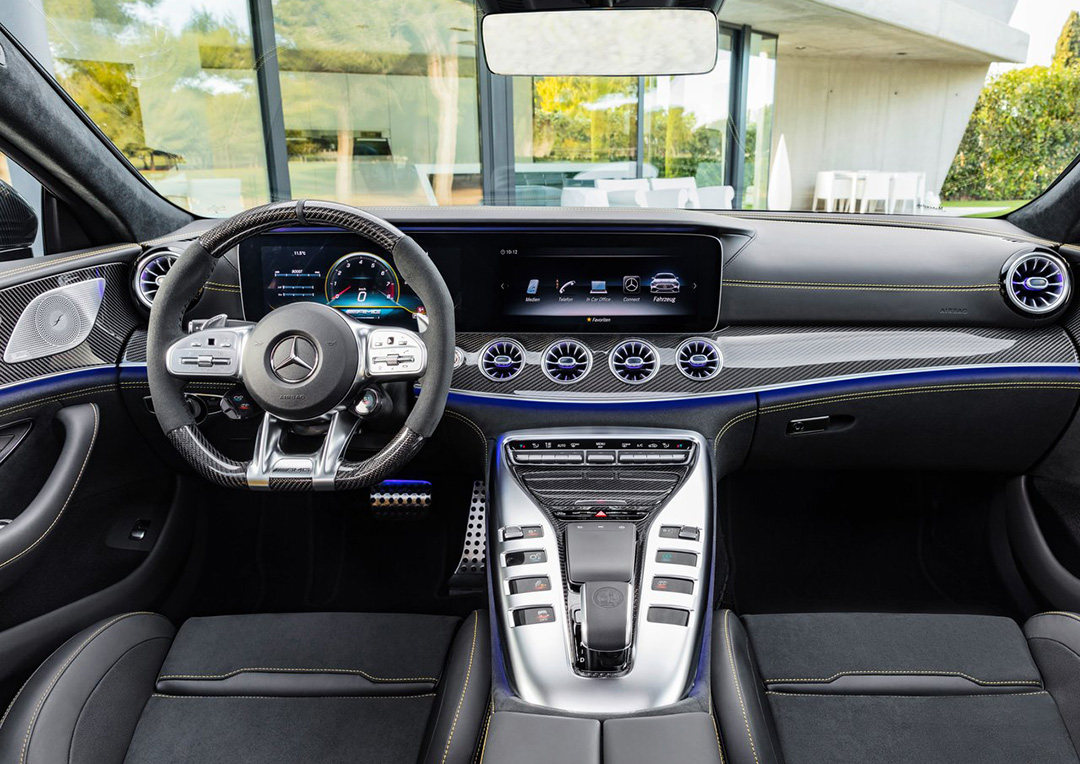 AMG GT 4门跑车共提供四个版本以及四种动力,性能最强的当属AMG GT63S 4门以及AMG GT63 4门。这两款车型均搭载AMG 4.0升V8双涡轮增压发动机,63型号的发动机可压榨出585马力,对于位于车型顶端的63 S 4MATIC+,639马力,峰值扭矩900牛米,这样的数据不输双门超跑。而3.2秒的百公里加速和315公里/小时的极速,也足以让目前地球上任何一款四门车都无法近身。当然,如果你是对性能要求并没有那么极致,AMG GT 4门跑车同样提供了53以及43两款“不署名”的3.0升直列6缸发动机,43车型最大367马力,53车型最大435马力。这四款车型皆匹配9速自动变速箱。