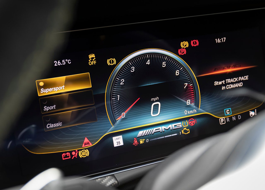 新型AMG高性能方向盘可选配额外的新颖功能。相关装置包括一个位于方向盘右下方的圆形控制器。驾驶员可通过控制器直接调用AMG驾驶模式,所选用的驾驶模式会出现在屏幕上。
