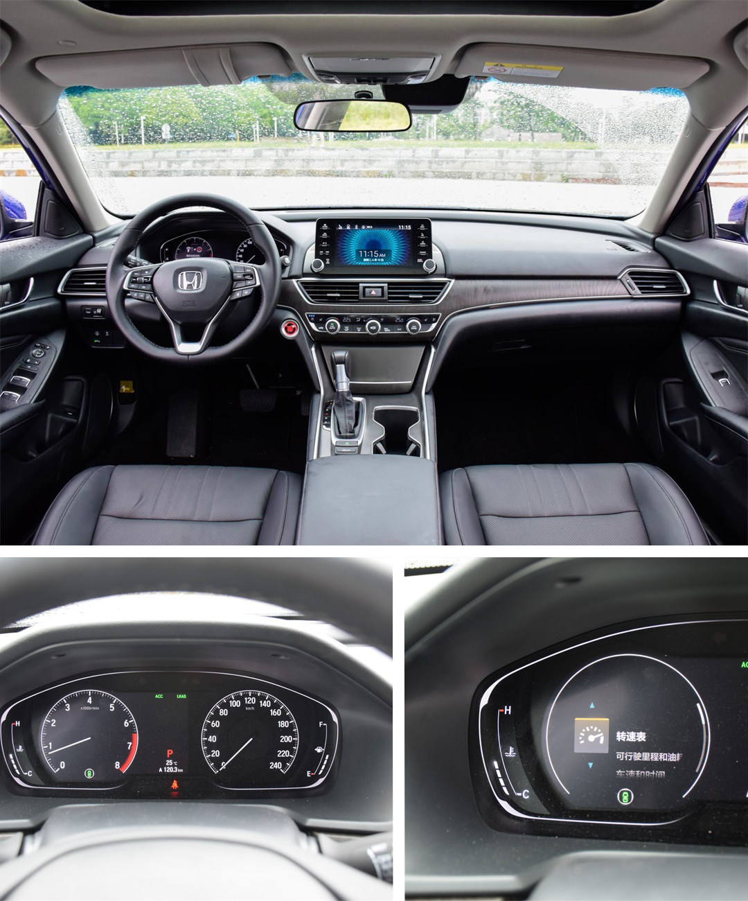 全新十代雅阁内饰材料采用软质材料、皮革以及木纹饰板,装饰线条为哑光银。中控部分为8英寸悬浮式触摸屏,功能控制按钮大部分为旋钮设计。仪表盘为左液晶屏右速度表盘显示设计,行车信息、来电提醒等都在左侧显示。整体内饰风格简约且带有较强科技感。