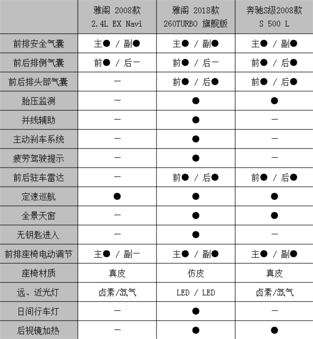 配置对比环节,我们请出08款奔驰S级车型与两款雅阁高配车型进行对比,看看号称领先业界水平十年的奔驰S级,与现在的汽车在配置上有多少异同。