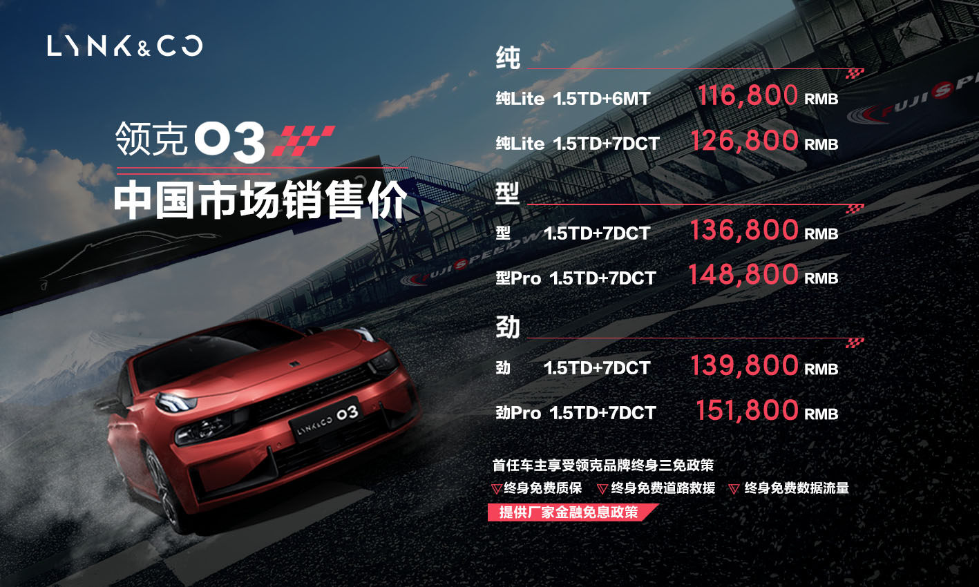 10月19日,日本 – 新时代高端品牌领克汽车旗下首款轿车——领潮运动轿车-领克03今日于日本富士国际赛道正式上市。本次上市的领克03共有纯、型、劲三种设计风格6款车型,中国市场销售价为11.68万元—15.18万元。为了让用户拥有更好的用车体验,领克汽车为领克03的首任车主提供了终身免费质保、终身免费数据流量、终身免费道路救援的三免服务。此外,所有领克03的用户还将享受到专属的厂家金融免息政策。