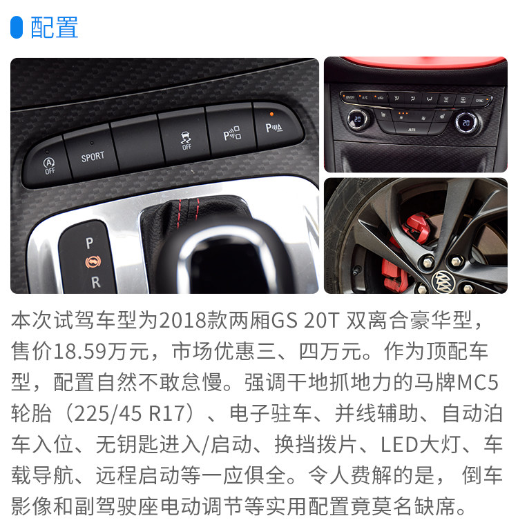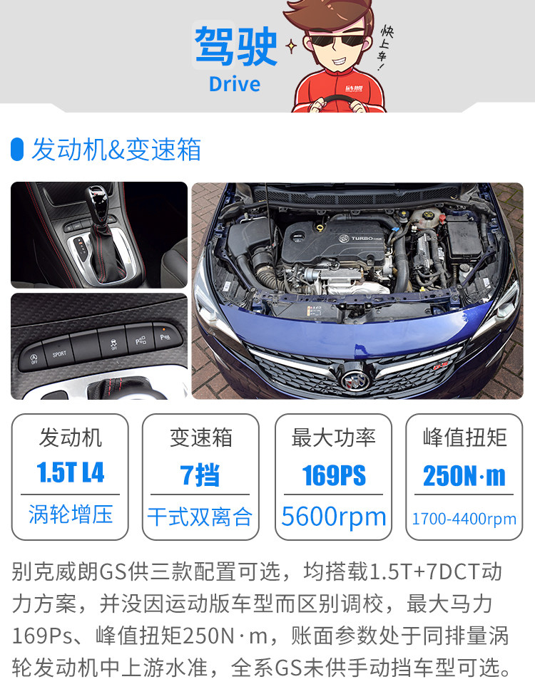 用表里不一来形容威朗GS再贴切不过,张狂的外表,却有颗佛系的心。169Ps、250N·m扭矩推动轻盈的1.3吨车重,动力只能说是刚刚够用,油门踩多了容易失望那种,这与通用自家制的七速干式双离合变速箱脱不开关系,典型的波箱拖引擎后腿。