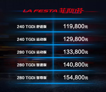 LA FESTA菲斯塔的英文名源自意大利语“盛会”,寓意“年轻人的狂热盛会”,象征自由奔放、热情活力。本次新车发布共有五款车型、三套动力系统可供选择,售价11.98-15.48万元。
