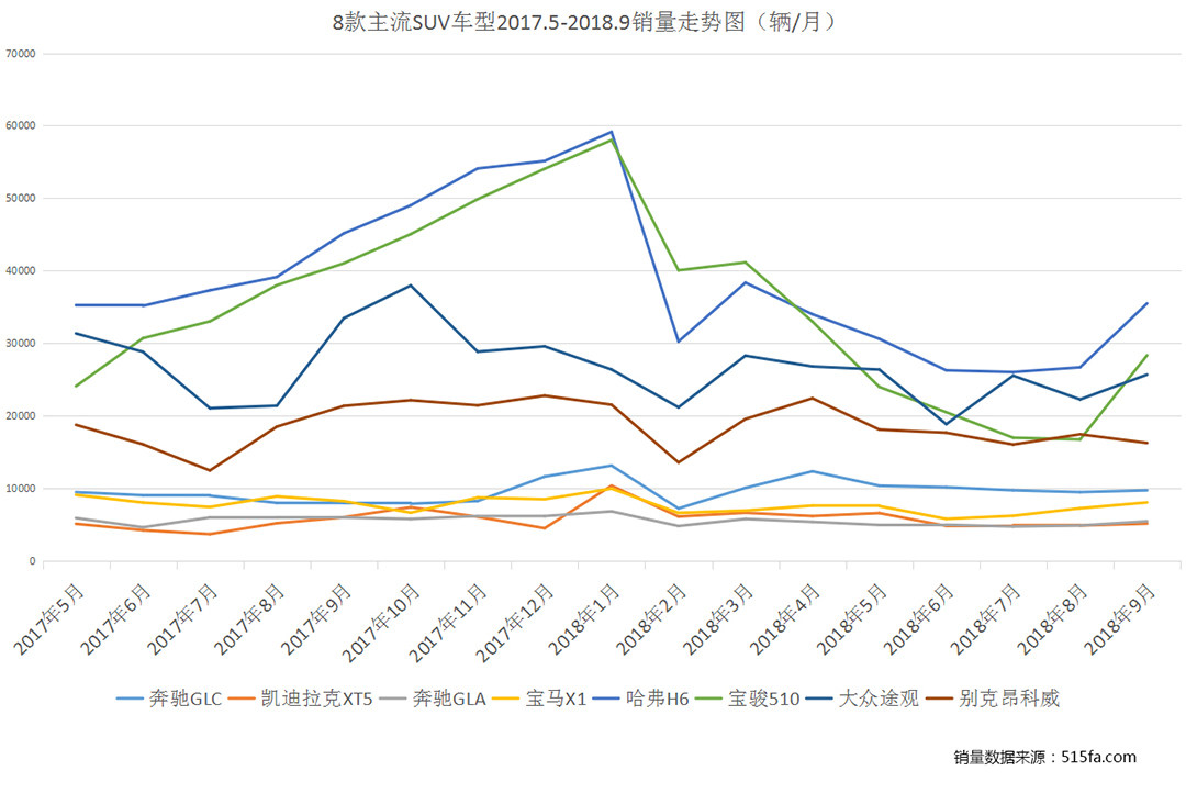 从销量图表上显而易见,四款豪华SUV的销量并没有受油价影响多少,表现一直非常平稳,途观和昂科威虽然也有一些波动,但是2018年相比较2017年同期销量变动不算大;到了宝骏510和哈弗H6这里,随着油价的上升,今年H6和510的销量明显不如去年,去年6-9月表现十分突出的H6和510,今年销量直接萎了。