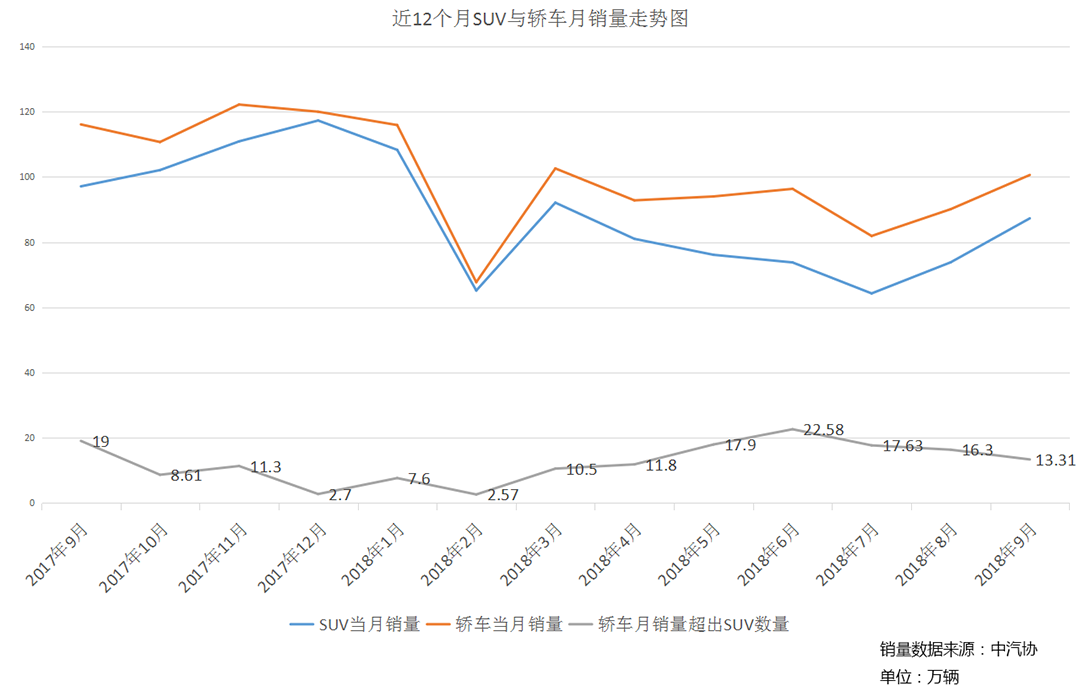 查看最近一年的汽车销量走势图的话就会发现,虽然2018年轿车和SUV的整体相比去年有所下降,不过从2018年3月开始SUV与轿车的销量差距就在飞速拉大,到今年6月差距已经达到了创纪录的22.58万,简言之,相比较轿车来说,SUV的热度减退要严重得多!SUV车型热度减退已经是不争的事实。