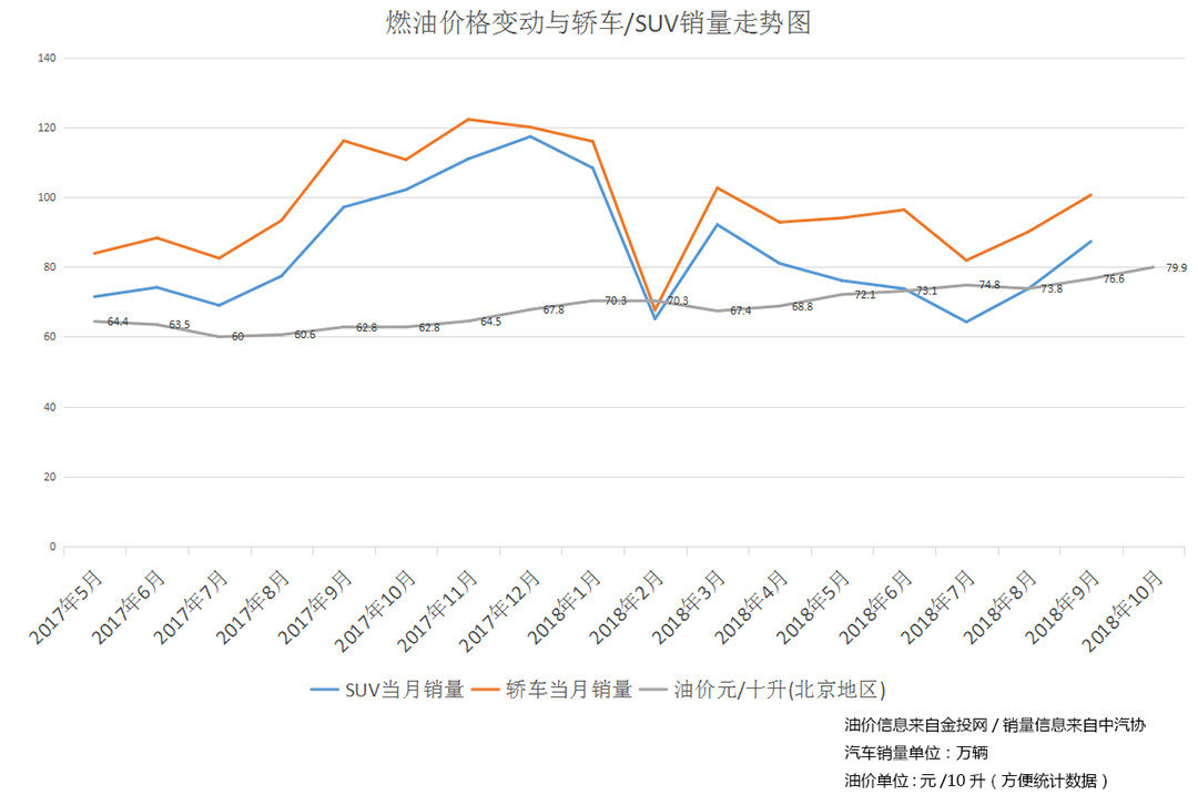从北京汽油重回7元时代开始,也就是SUV车型销量正式被轿车拉开距离的开始,随后汽油价格一路飙高,SUV与轿车的销量差距也越来越大,直到8月SUV和轿车的销量差距才开始逐渐缩小。看得出来,SUV的热度下降和油价上升有直接关系。
