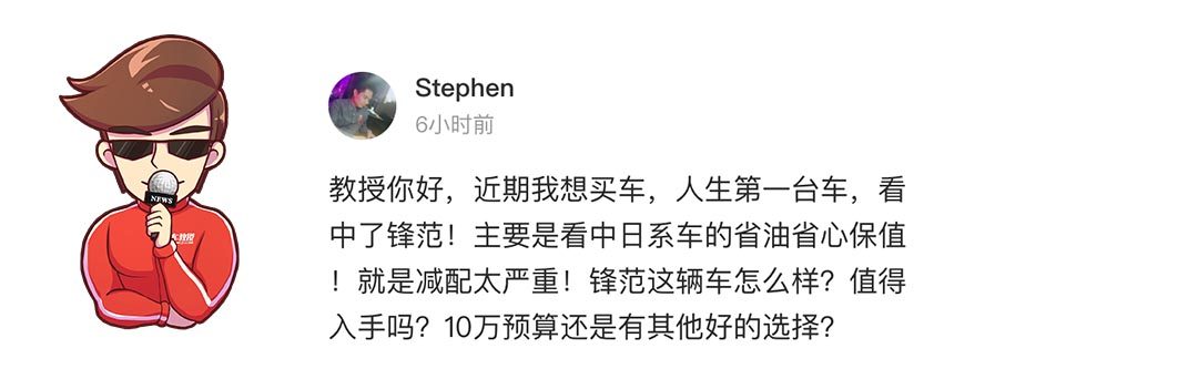 正如阁下所言,锋范确实是一款优缺点鲜明的车型。1.5L+CVT的动力总成在本田旗下的众多车型中收获一致好评,无论是加速性能,发动机和变速箱的匹配和实际油耗表现都是同级别中的一流的水平,同时稳定的品控也是省心的重要来源;本田“MM”理念下将车厢内的可用空间发挥到了极致,经实测后180厘米的大壮汉在后排也能获得超过两拳的腿部空间。但可惜配置实在过于简陋,刹车辅助、牵引力控制、ESP等基础的安全配置,唯顶配独享,与时下各种潮流,新颖的科技配置完全绝缘。本田的“吵”和“硬”也是一样没有落下。