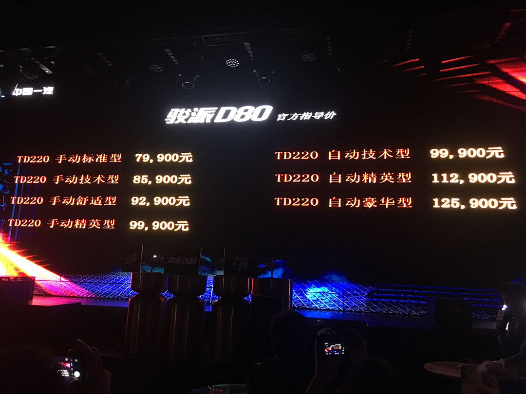 2018年10月26日,天津一汽骏派全新SUV——骏派D80正式上市,官方售价为7.99万-12.59万元,D80与在售的骏派D60相比,无论是车型尺寸还是定位级别都会更高,更为主流的产品形象,也会是天津一汽的品牌阵列里占据重要地位的一款SUV。