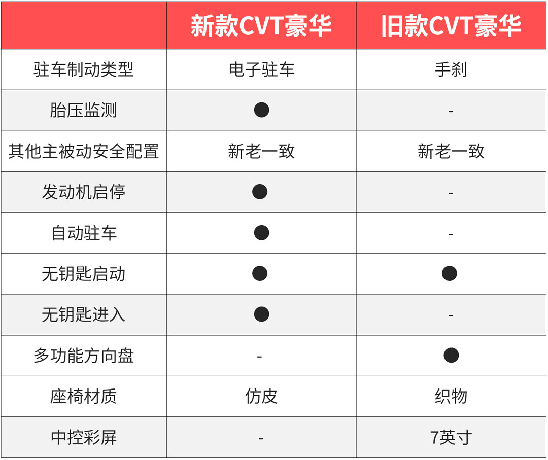 来看一下价格,基本上新款和旧款每一个车型都是相对应,价格基本接近。不管是新款还是旧款教授都推荐CVT豪华版或者以上车型,价格配置各方面都比较合适。以CVT豪华版为例,新老车型的裸车价都为11.98万(旧款算综合优惠,各地或许有些差异)。在同样的价钱下,新款的配置无疑更丰富些,而且尺寸也比旧款大一些,原本旧款就是以空间为卖点,新款空间表现能力无疑更上一层楼。