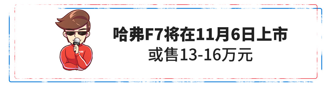 据悉,哈弗F7将在11月6日正式上市,售价区间大概在14-16万元。作为哈弗品牌新车系的重要车型,哈弗F7与H系和M系的车型在设计上有着比较大的差异,F7的造型更为犀利、动感,能吸引更多的年轻消费者的关注。但是动力总成方面,哈弗F7将搭载1.5T与2.0T发动机,采用和哈弗一贯的调校方式,实际驾乘体验偏舒适、实用。