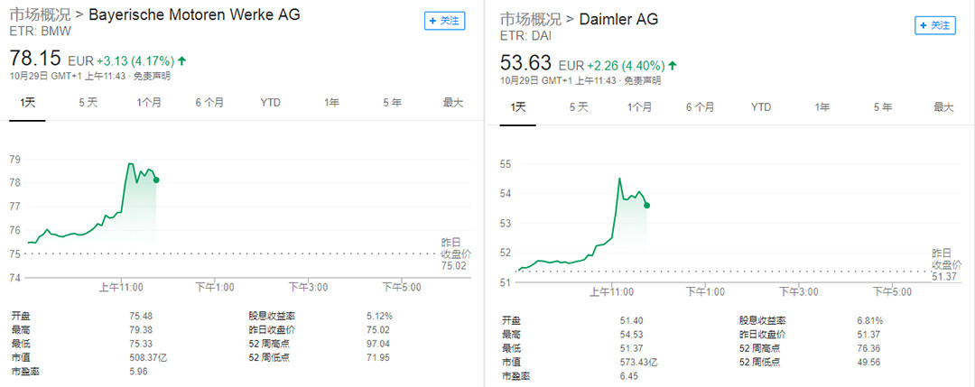 戴姆勒和宝马29日中午的股票走势都表现的很坚挺