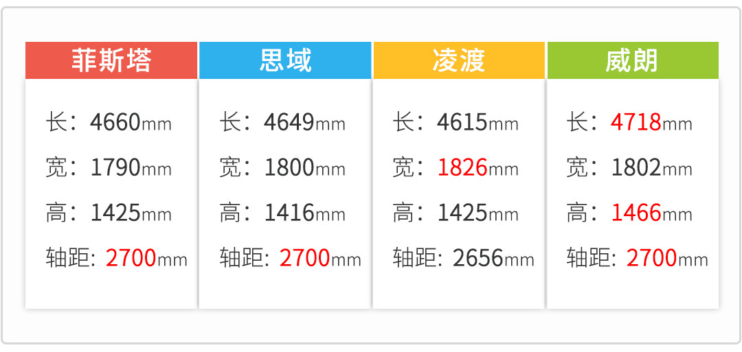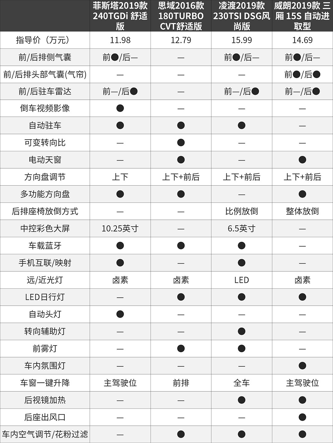 教授也不含糊,直接给出四款车的自动挡入门车型的配置对比,孰优孰劣,一目了然。可以看出,威朗在安全及舒适性上面的配置是蛮多的,包括前排侧气囊、前后排头部气帘、后排出风口、车内氛围灯等都有配备,再考虑其3万以上的终端优惠,整体性价比非常高。凌渡虽然配备了中控大屏、LED大灯、全车窗一键升降等配置,但考虑其较高的售价以及不多的优惠,所以就配置而言其性价比一般。