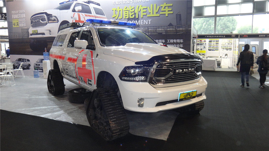 道奇RAM 1500雪地救援皮卡,四个车轮都改为了履带以防止陷车,货斗加了盖,用于存放救援设备。