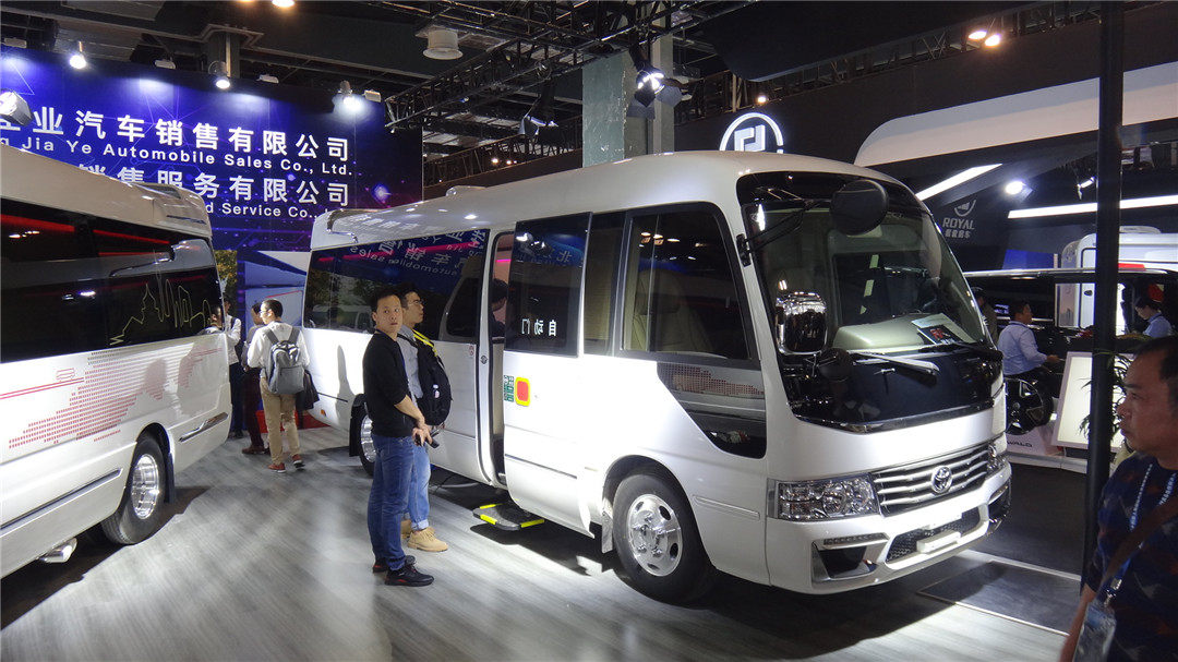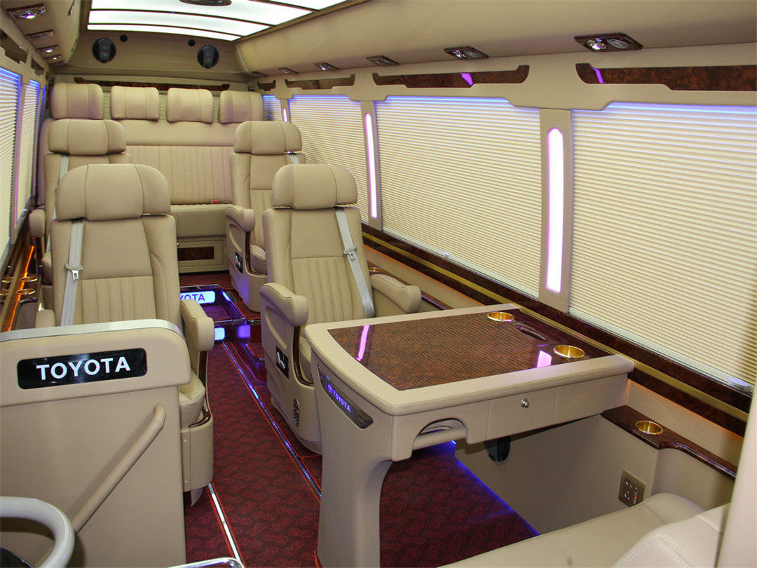 丰田考斯特改装中巴车,黑色隐私玻璃和淡黄色车身很有领导feel,其中一辆的前脸还改成了埃尔法风格。而内饰也是豪华风格改装。
