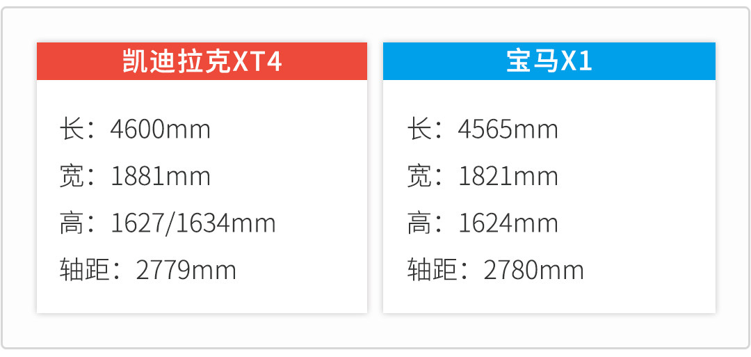 两车除了轴距无限接近,凯迪拉克XT4的车身尺寸足足比宝马X1大了一圈,不过总体来说,两款车型都是比较标准的紧凑级SUV尺寸,不过还是凯迪拉克XT4看起来会大一些。