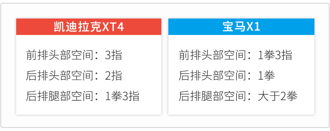 虽然凯迪拉克XT4的车身尺寸更大,但我们刚刚也说过了宝马X1的空间表现是有bug的,所以我们收集到同是4500px的试乘员通过常规测量方式所得数据中,宝马X1的空间表现真的是异常出色,虽然我们也不知道到底宝马X1开了什么挂,但我们知道这个空间表现即使放在中型SUV里,也是难逢对手。(实际后排腿部空间在3拳左右)