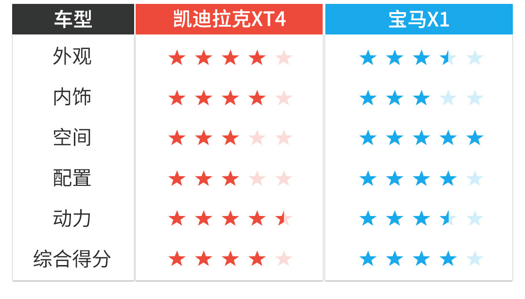 其实两车的优劣势都非常明显,注重外观内饰,选凯迪拉克XT4,注重空间配置选择宝马X1,但话说回来,毕竟外观设计这种的东西,比较仁见仁智,所以凯迪拉克XT4这么个性的外观设计也不一定就是优势(内饰优势无可厚非),反而像宝马X1这种简单的设计受众面会更广,所以宝马X1大卖确实是实至名归。那么对于那些喜欢钻石切割设计的朋友来说,凯迪拉克XT4能争取一点优惠也必定是一个很不错的选择。