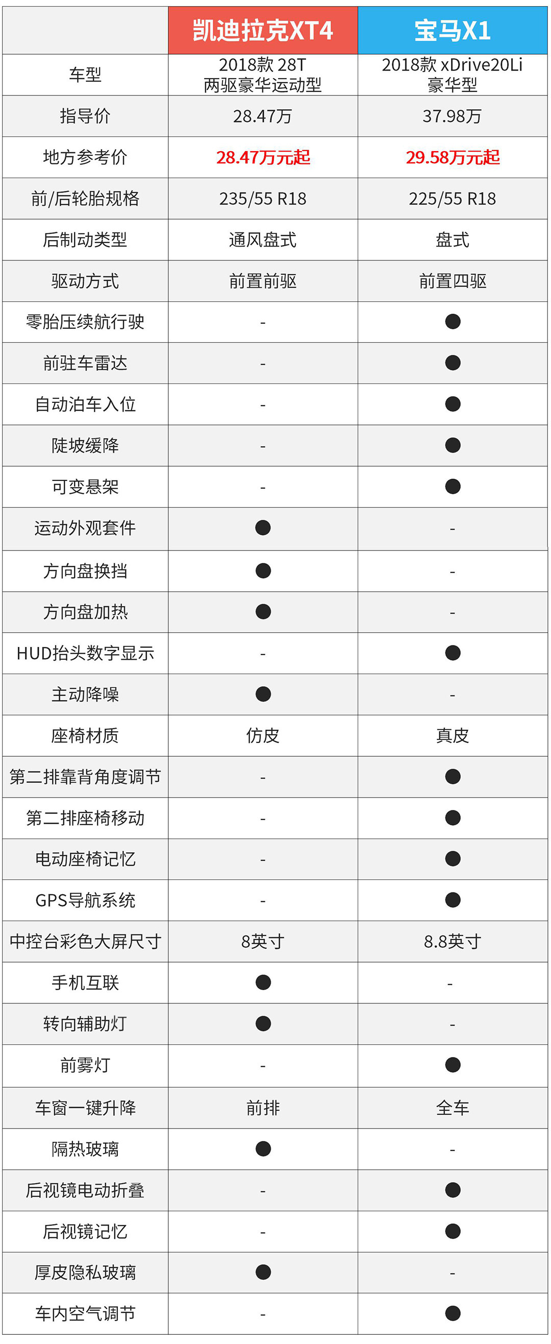 由于目前国产的宝马X1是有很大优惠幅度的,而凯迪拉克XT4是刚上市的车型,所以我们以地方参考价(宝马X1优惠过后)为准,选两款性价比都不错的配置车型做对比,可见宝马X1的配置还是更具优势的。所以不仅让我们猜想如果XT4能够早日放出优惠,那可是一个更吸引的选择?