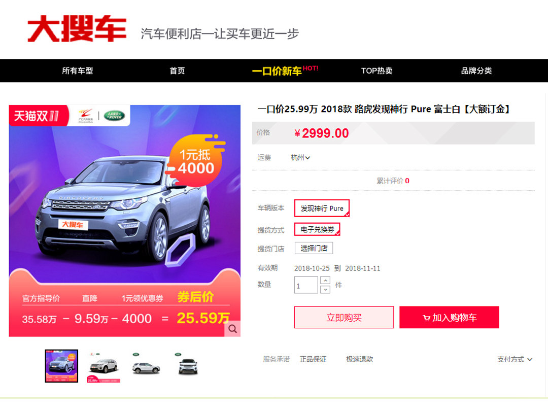 在这次天猫双11活动里面,许多市面上的热门车型都给出了空前的优惠幅度!就像教授颇为欣赏的一款前卫、多功能性SUV--路虎发现神行现金直降9.5万,还赠送送价值12000元3年6次免费保养兑换卡(指定门店享受); 前20名下订额外送1000元油卡(聚划算当天生效),贷款购车享有金融贴息8000元,与优惠券权益不叠加。