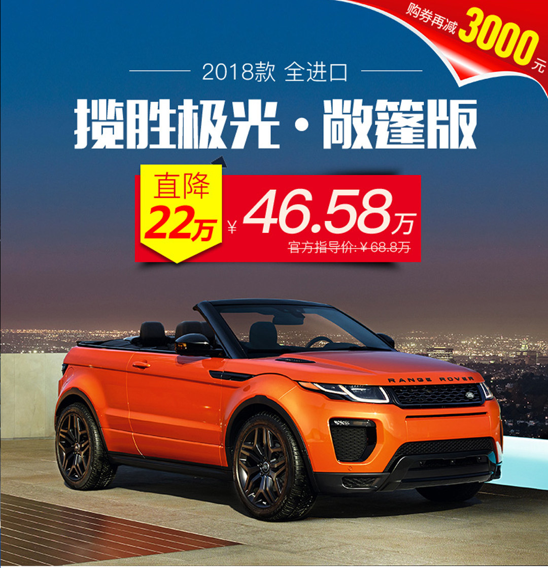 另外路虎极光(进口)18款2.0T HSE DYNAMIC敞篷车型现金直降22万,送价值12000元3年6次免费保养兑换卡(指定门店享受)!订车送3000元油卡(同大搜线上油卡权益),金融贴息8000元,与优惠券权益不叠加。