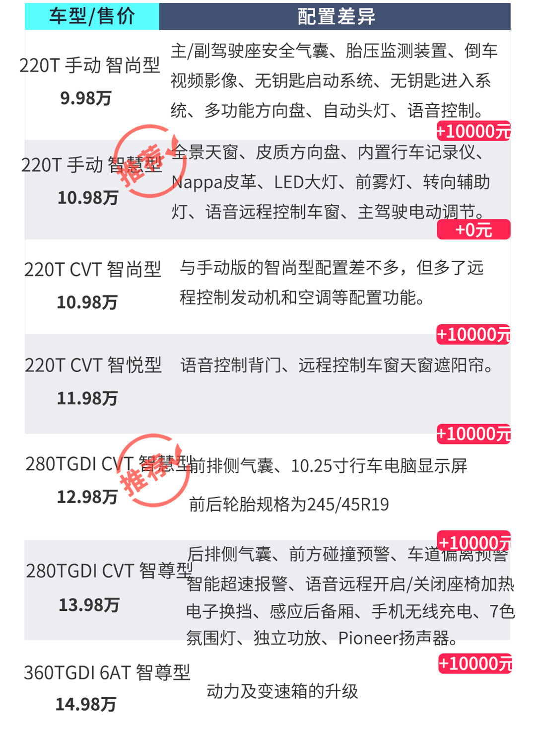 从上表可看出,CVT智尚型与6MT智尚版本,除了变速箱不同之外,大体配置相同。CVT版本则多了智能互联操作,比如远程控制发动机等功能配置。而CVT的智慧型和6MT智慧型也大体一致,除了变速箱不同之外,基础性配置都是非常丰富的。