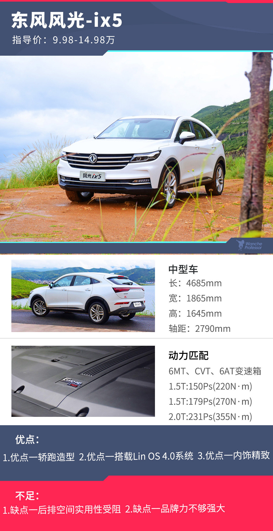 继580之后,东风风光推出一款轿跑SUV-ix5,旨在丰富产品线路的同时,提高品牌形象力。10月31日,东风风光ix5正式上市。售价为9.98万-14.98万,推出360TGDI、280TGDI、220T三种动力共计7款车型。那么,在这么多款配置车型里,哪一款车型最值得购买呢?且听教授几句分析。