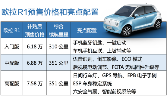 · 欧拉R1预售期间共推出三款车型,补贴后预售价格为入门版6.18万元,中配版6.88万元,高配版7.58万元;