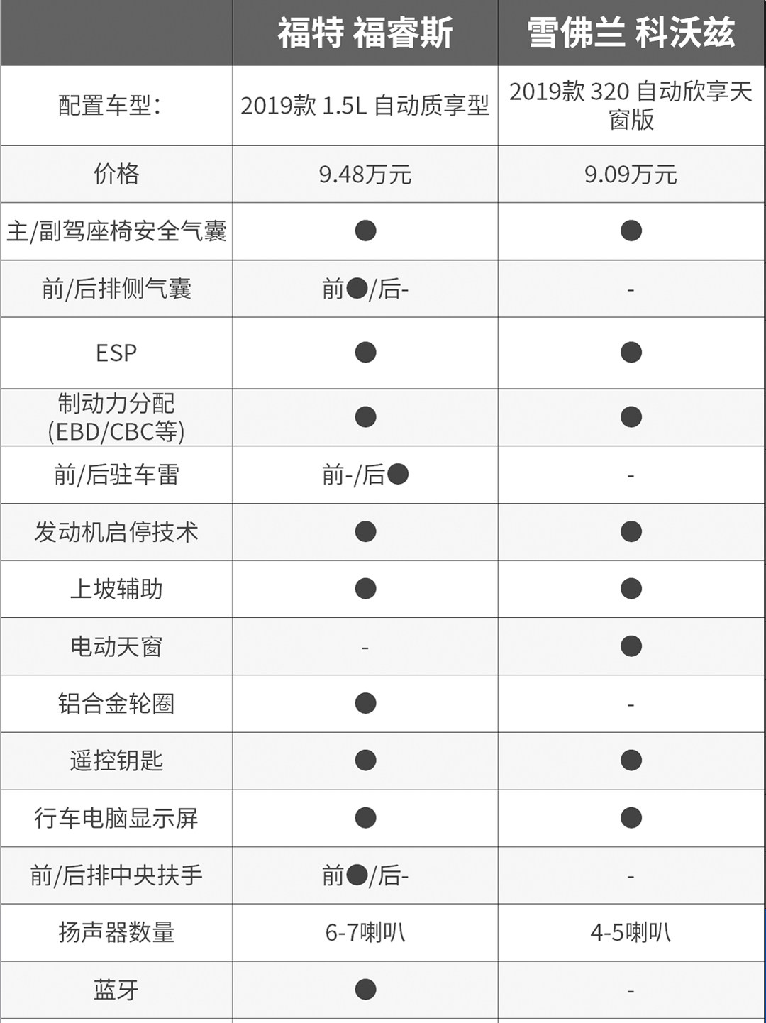 我们可以直观发现这两款价格接近的车型在配置方面差异在于福睿斯多出了后盘式刹车、前排侧气囊、后雷达、铝合金轮圈和蓝牙电话等等!科沃兹则提供了电动天窗和仍然采用直列4缸发动机。