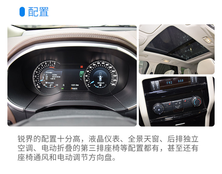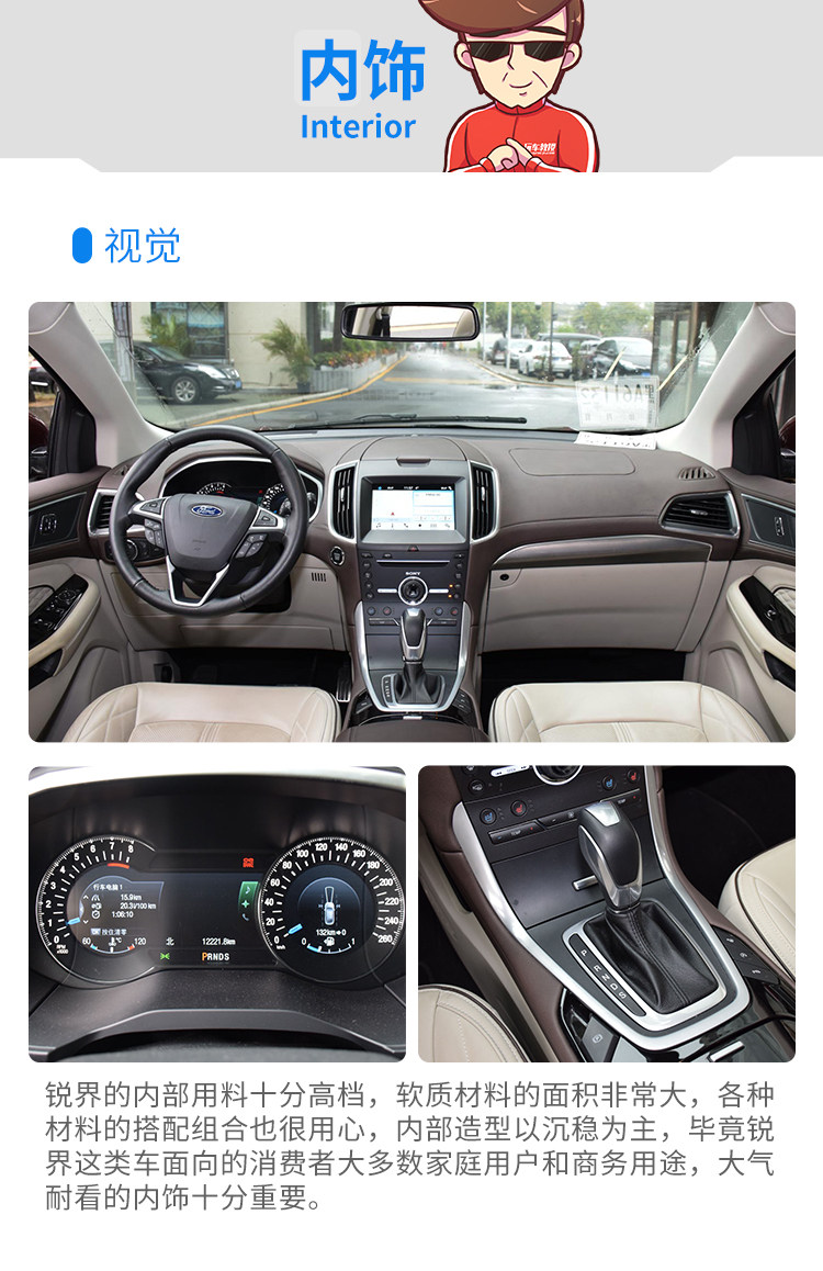 日常驾驶时锐界的转向指向性不错,路感也比较充足,助力并不会太重,即使是女士驾驶也没有问题,转向的表现值得称赞,底盘也很有厚实感,悬挂动作比较干脆,滤振也充分,因此舒适性和运动性兼顾得比较到位,再加上锐界顺畅的6AT变速箱和强大的动力,不管是开锐界还是坐锐界,给人的感觉都是比较不错的。