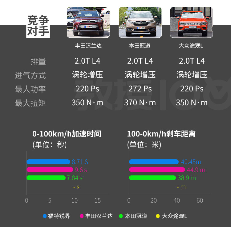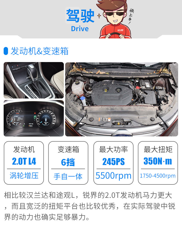 锐界的这台2.0T发动机能够输出245马力/350牛米的动力,而且与之匹配的6AT变速箱没有双离合和CVT变速箱那样的起步保护,所以锐界从起步开始就十分暴力,加速的势头从起步一直到70km/h都很猛,发动机换挡也比较快,最终8.71秒破百的表现比起实测的汉兰达好了不少。