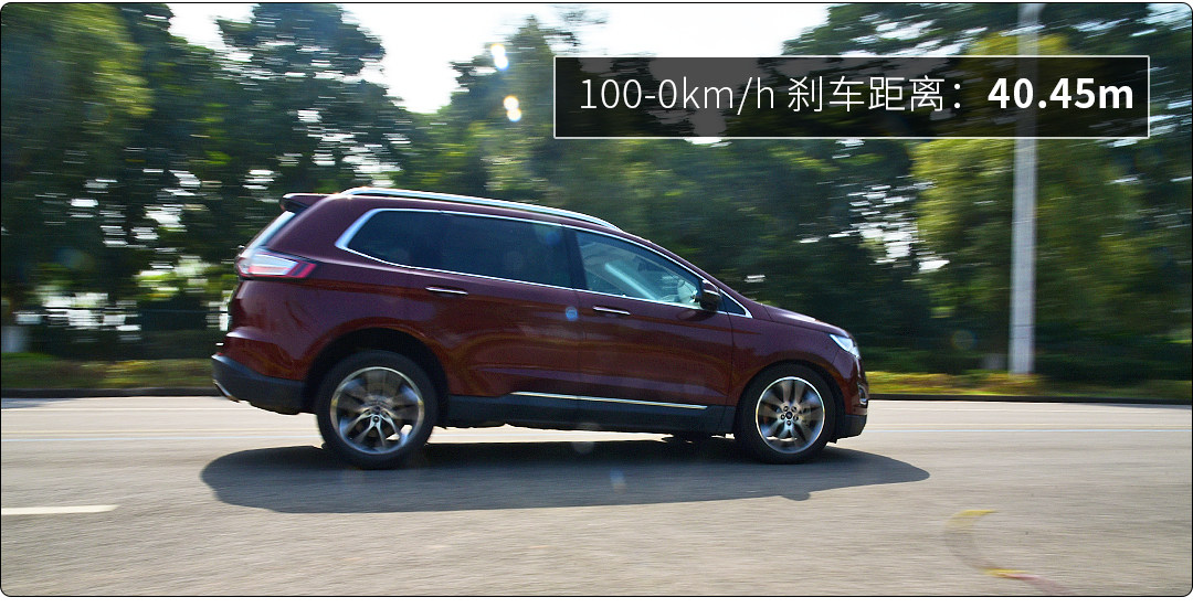 相比较汉兰达44.9米的实测刹车距离,锐界的表现明显好了不少,40.45米的刹车距离对于这个级别这个吨位的SUV来说非常出色了,制动过程中锐界的表现足够安稳,制动力也比较均匀,不过由于锐界自重大,悬挂行程也不短,因此全力制动时车身姿态并不好看。