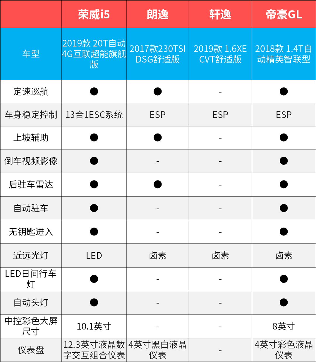 一如表格所显,毫无意外两个国产担当在配置层面几乎是碾压合资的存在。尤其在氙气已经逐渐成为标配,LED更是大行其道的当下,两款合资车型配备的依旧是卤素的远/近光灯。同时中控大屏也是不见踪影。而四者当中最出众的当属荣威i5,安全性、实用性的配置一应俱全,此外13合一的ESC系统可有效矫正车身不稳定性,降低行车事故发生;12.3英寸液晶数字交互组合仪表盘和中控10.1英寸的彩色大屏所营造的科技感堪称同级标杆。