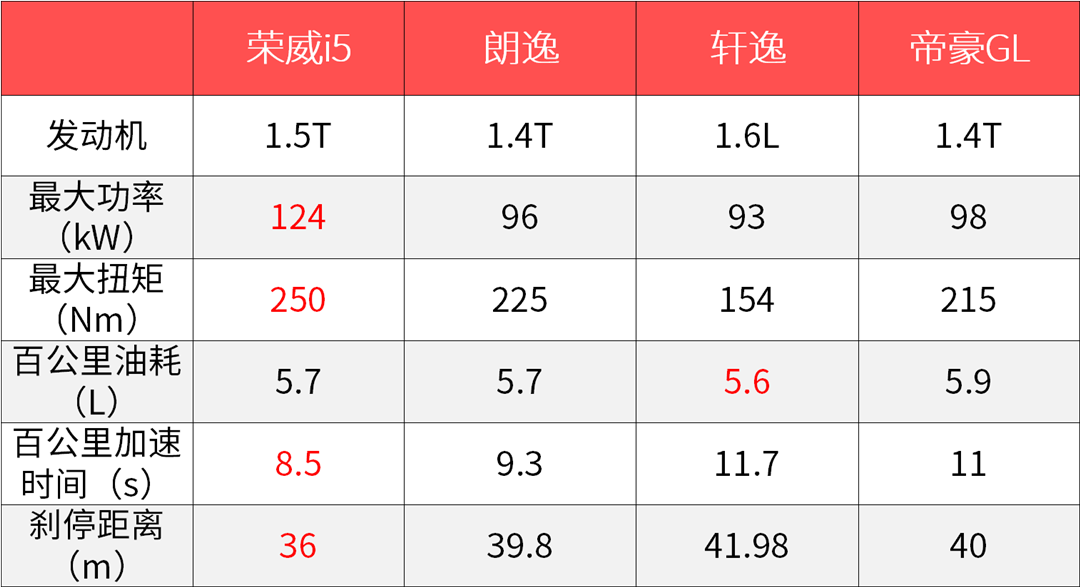 在动力层面,荣威i5的综合表现和其余三者已经不属于同一个层级。出色的表现与强大的上汽“蓝芯”1.5T SGE20T发动机密不可分。全铝材质,缸内中置直喷,以及小惯量涡轮技术的加持下,再辅以主打运动操控性能的米其林PS4运动型轮胎,造就了四者中最快的破百时间与最短的刹车距离。而每百公里油耗仅仅是比公认省油的轩逸高了0.1L。
