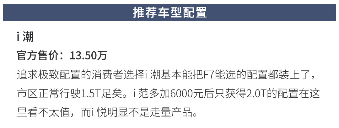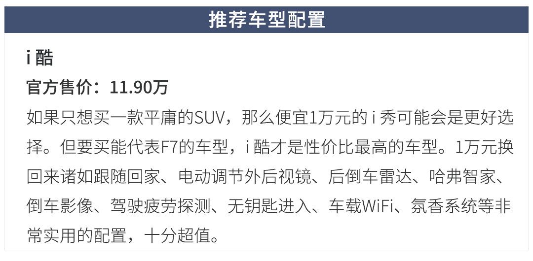 SUV未来到底是春药、良药还是毒药,万万不可走入极端。就像勒夏特列原理和洛伦兹定律可以引申到其他学科,物极必反、终归平衡。SUV热潮放在汽车百年历史长河中,也将只是一阵浪花而非永久性的趋势,在市场主打“时尚潮流”的SUV那么多的情况下,F7会成为最闪的那颗星吗?”