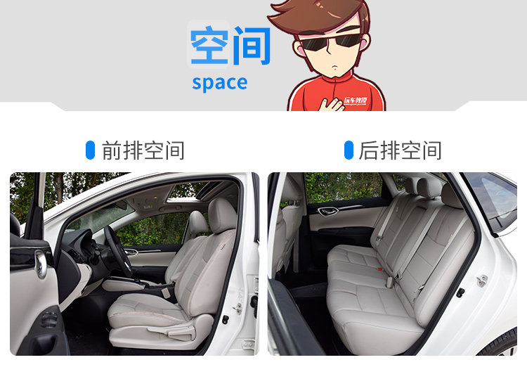 轩逸纯电后排地台升高,所以头部空间遭到了压缩。以教授173cm的身高坐进去,前排还可以调节靠背角度腾出头部空间,后排则略显尴尬。