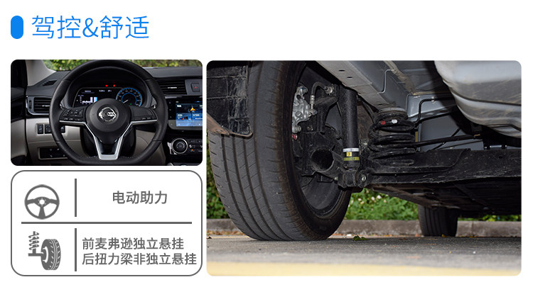 轩逸·纯电的底盘悬挂为前麦弗逊,后扭力梁悬挂,方向盘助力为电动助力,是这个级别的标准配置。