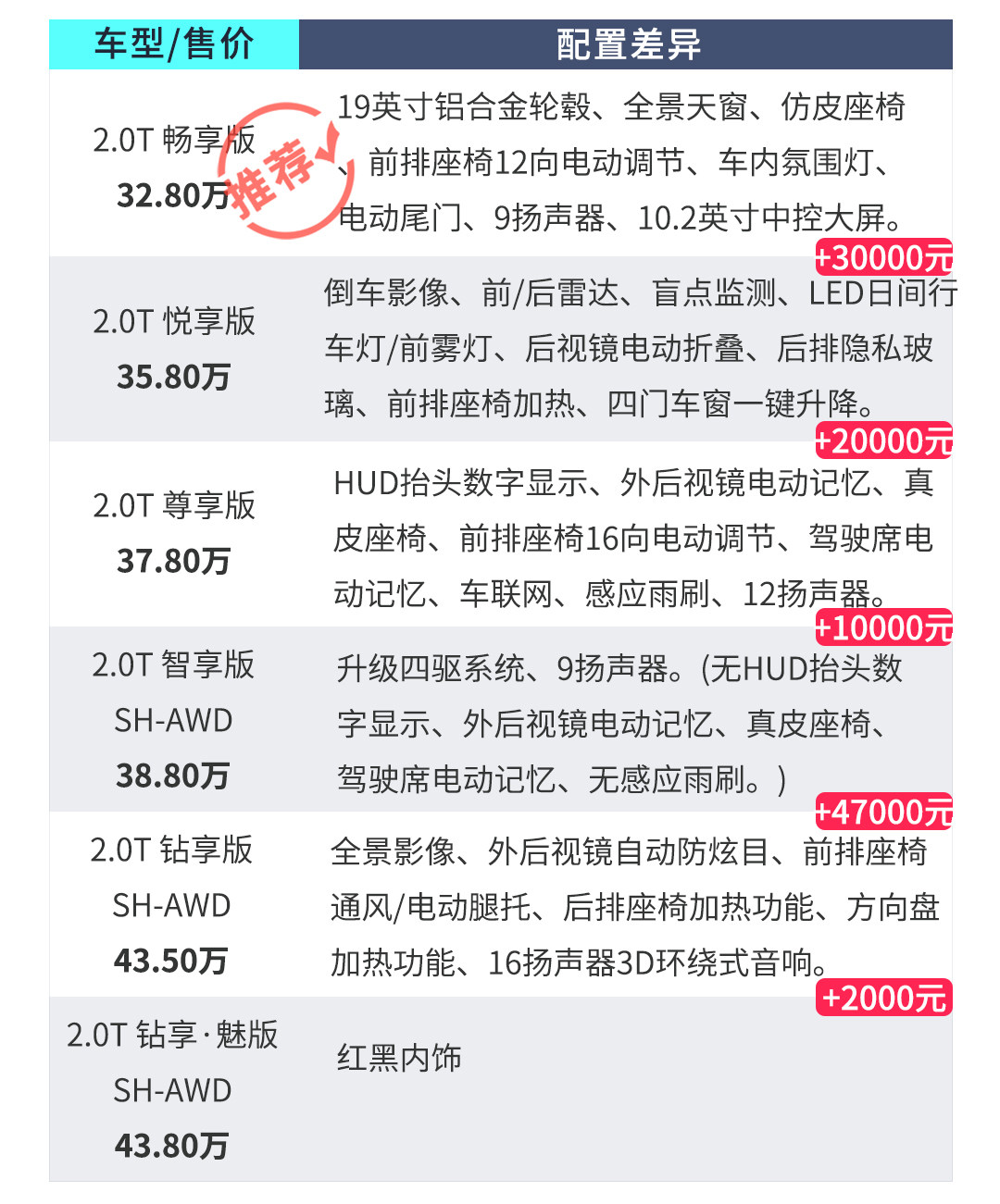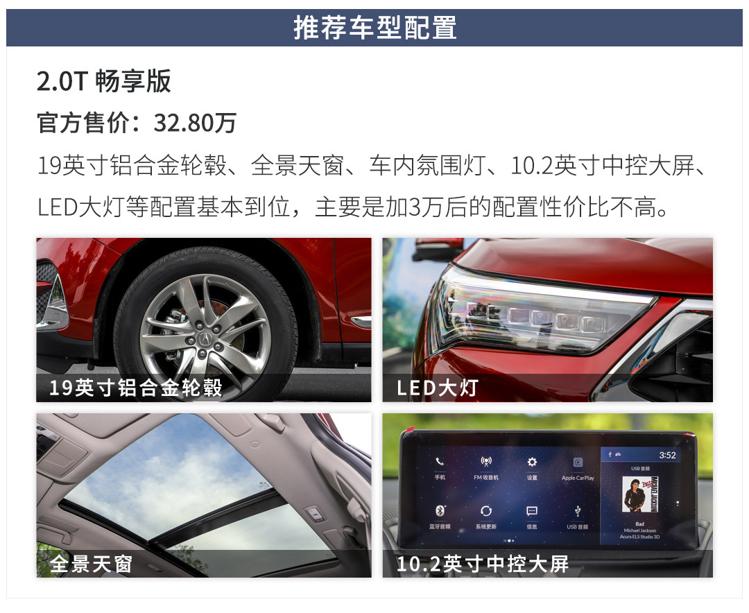 首先配置分为两个部分,两驱版和四驱版,如果不是长期雨雪天气的地区,那其实两驱版就够。讴歌RDX的起售价出乎我们意料,而配置与配置之间的价格差距其实不少,比如畅享版加3万后的悦享版,也就倒车影像和LED日间行车灯比较吸引,其他配置都不是必须的(这个当然因人而异),所以个人认为既然给出这么有诚意的起售价,而且配置也不低,所以最推荐的是最低配畅享版。