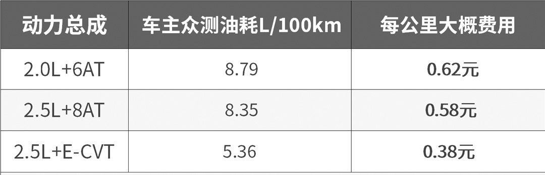 总体来说凯美瑞的油耗表现不错,而它只需要喝92号的汽油就可以了。另外高热效2.5L发动机的动力驱动较大的车身动力比较充足而且配合8AT变速箱,油耗表现也不错。混合动力车型则带来了超低的燃油成本表现。