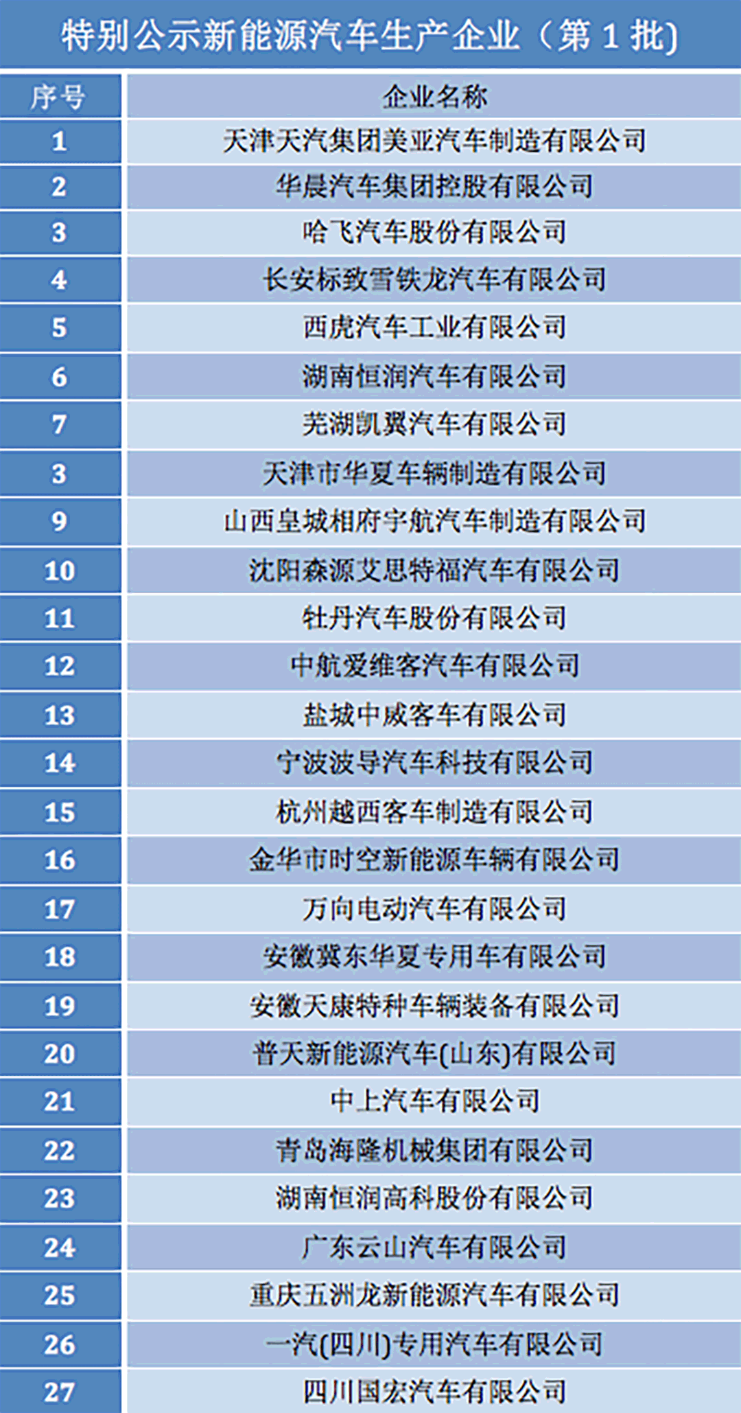 11月7日,工信部正式发布《特别公示新能源汽车生产企业》公告,对停产12个月及以上的新能源汽车企业予以特别公示,长安标致雪铁龙、华晨等整车生产厂家位列其中。相关企业再次生产需要重新经过工信部核查,不能保持准入条件或破产的企业,将被撤销资质,而企业已经进入免税目录的车型也将被剔除。这次27家车企被暂停新能源汽车新产品申报,生产资质面临被撤销,说明了国家开始了新能源汽车资质大清理,可以预计,此前在制度还不完善时便拿到了新能源汽车的生产资质,但并没有投入新能源汽车的研发与生产的企业将被清理。(消息来源:汽车行业关注)